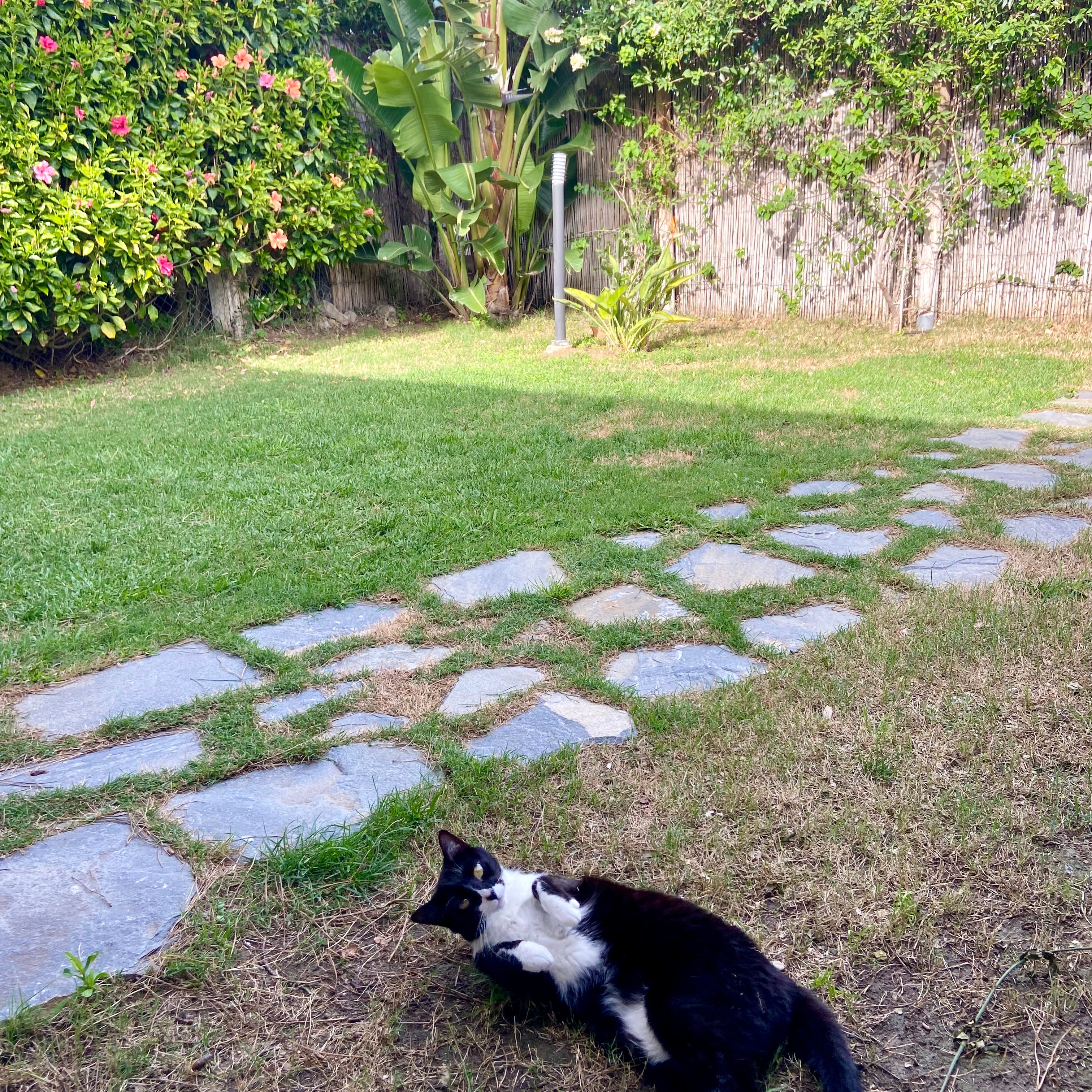 Y sus maullidos son cortos, mucho más cortos y menos agudos que los endecasílabos de la reina de nuestro jardín. Igual de cariñoso y más interesado. Cuando ha recibido su ración de mimos, se marcha por donde ha venido, por un hueco diminuto entre el suelo y la valla, bajo la pared de hibiscus.
